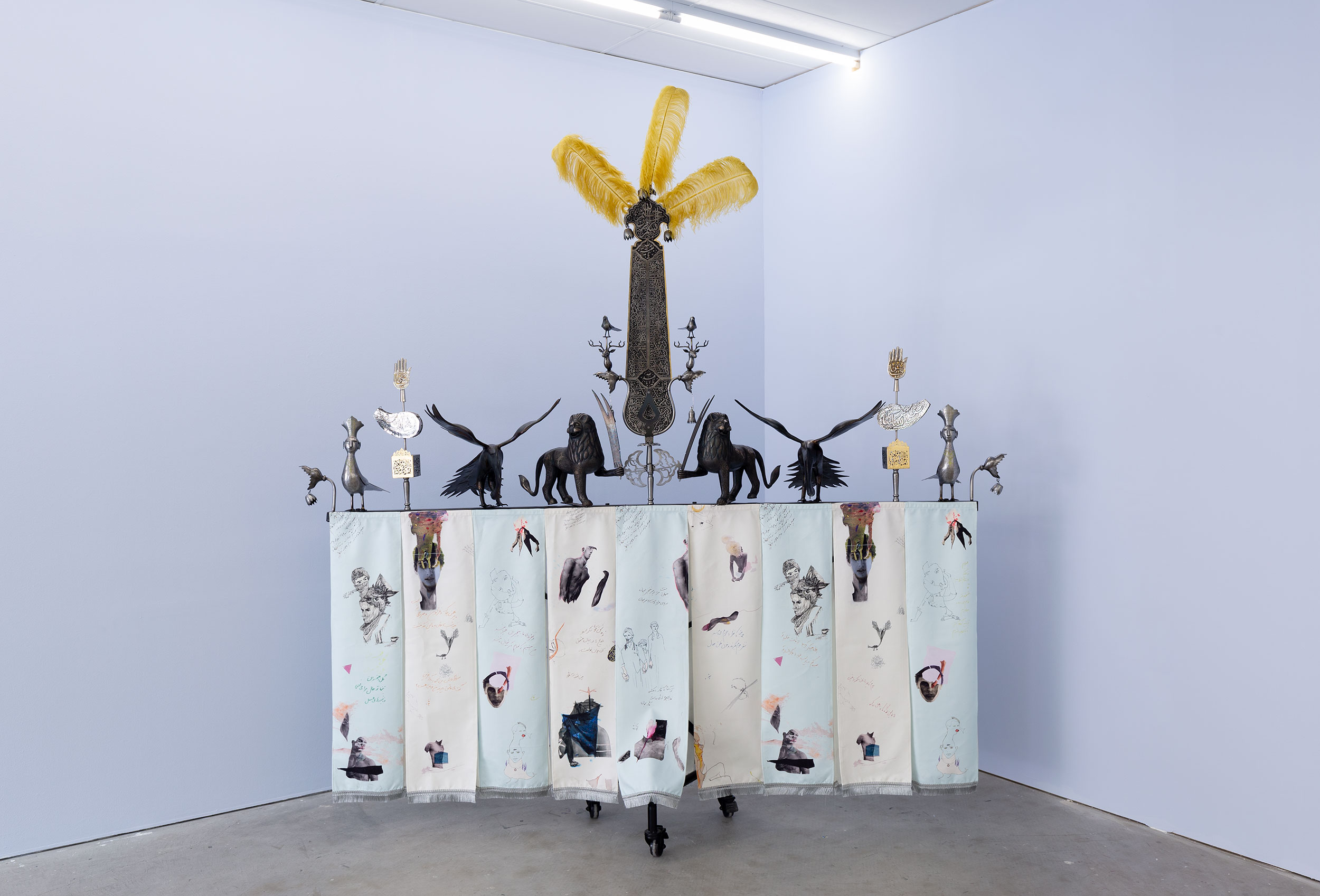 Elyas Alavi, We, of Secrets Kept Hidden, 2024 , gold leaf, iron, steel, prints on velvet, 310cm×300cm×70cm, Gertrude Contemporary, photo Kai Wasikowki